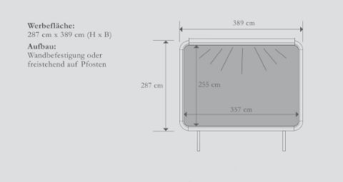 Angeleuchtet und auf einem 2,5 m Monofuß. Die Werbefläche ist ca. 2,9 m x 3,9 m (BxH) groß.